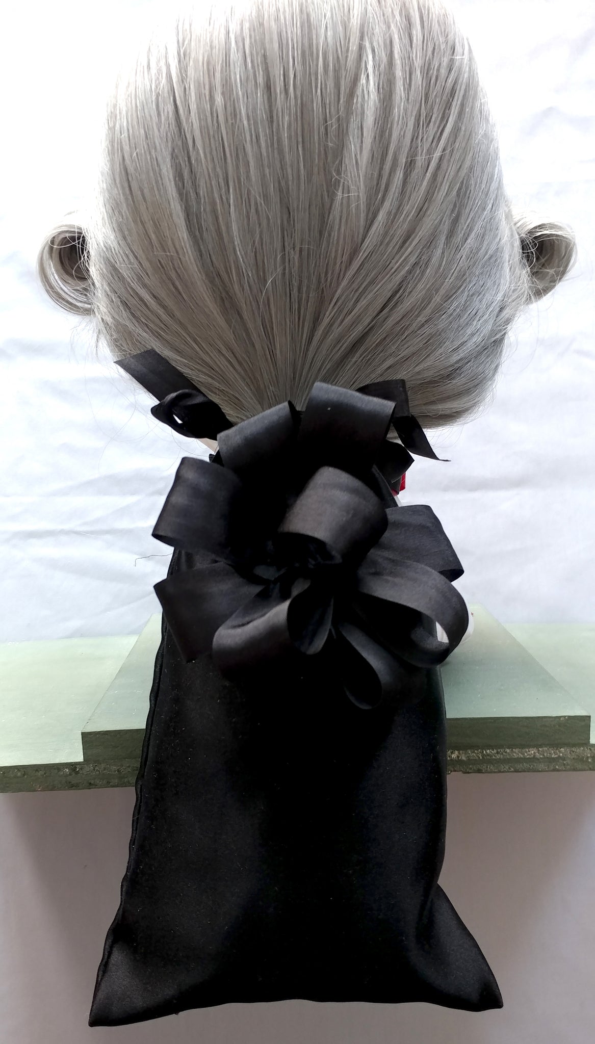 This digital pattern helps you reproduce an eighteenth-century men’s wig bag, an accessory characteristic of formal dress throughout much of the Georgian period. Developed from period portraits, extant examples, and documented sources, it offers an accurate reconstruction of this elegant yet practical element of male attire. The download includes a drafted pattern and step-by-step instructions for assembling the bag in silk, with guidance on finishing details such as a decorative ribbon bow, and ribbon ties. Accompanying historic examples are provided within the pattern to show how it would have been worn in the time period.